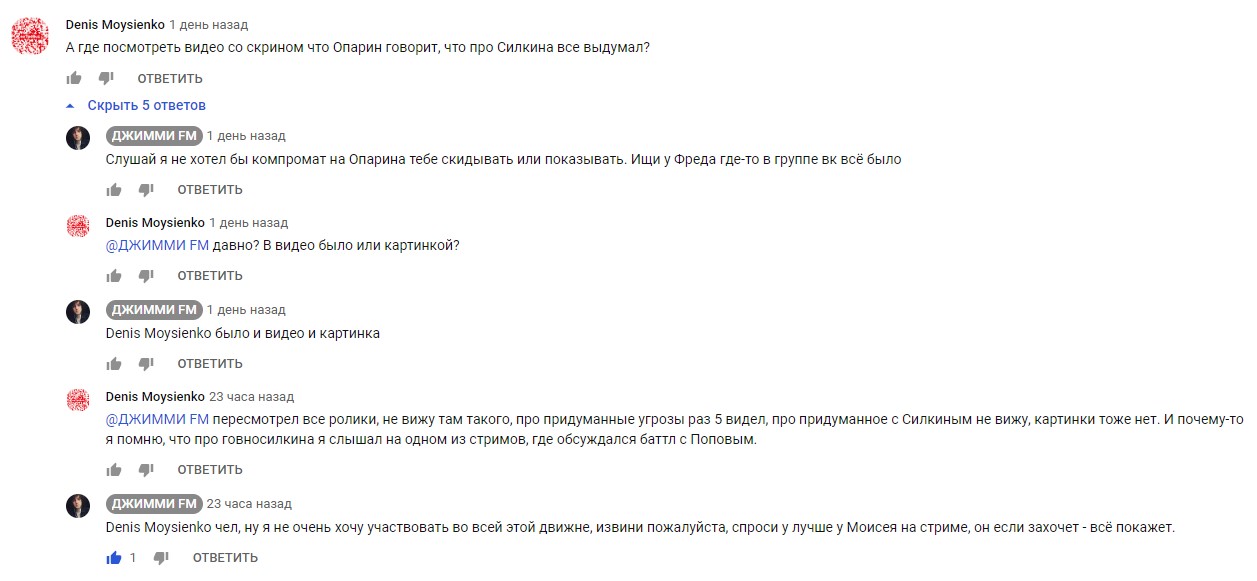 Вещает про какой-то скрин в его видео, которое он выпустил на 5 минут перед их "перемирием", где Опарин признается, что про говносилкина выдумал для того, чтобы начать хайп, спросил его где посмотреть видео, начал отмазываться типа ищи у Фреда в ВК, пришлось смотреть всю эту ***, но скрина так и не увидел, написал ему, он меня послал к пеликанову, типа он не хочет участвовать в этом. Сделав вывод что такого скрина не существует. Кто нибудь вообще видел этот скрин?
