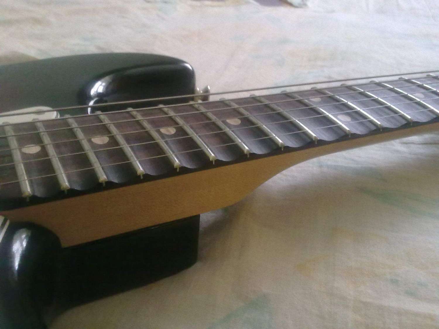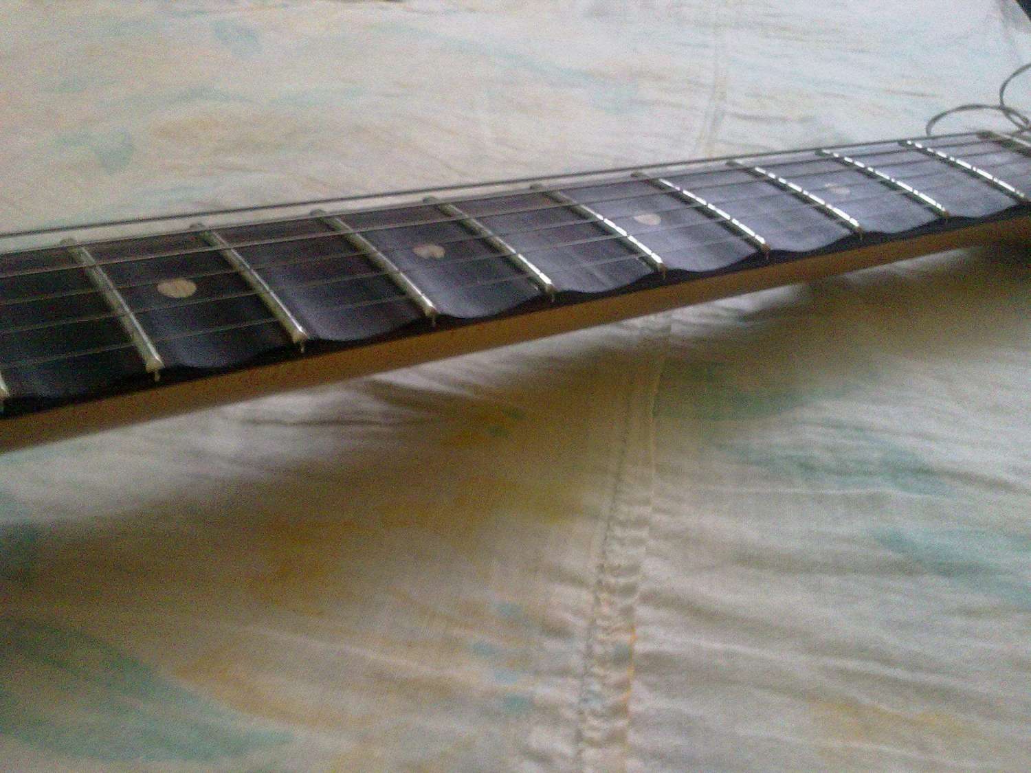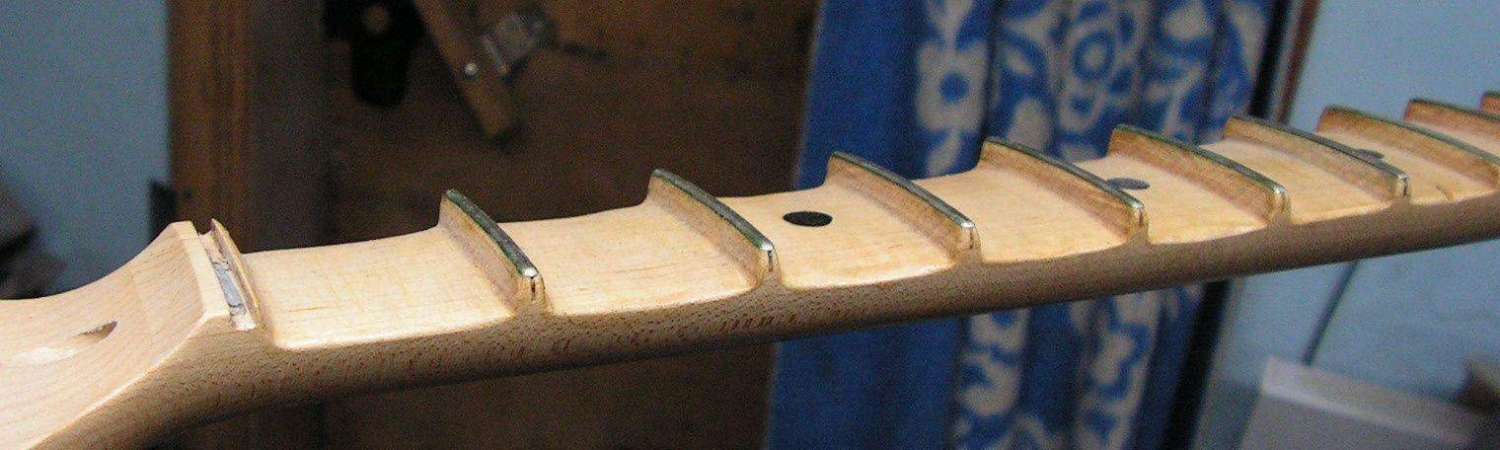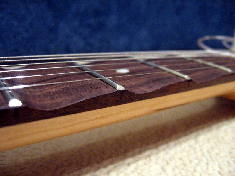 Заметьте, что опиливание древесины во время скаллопирования затрагивает инкрустацию, поэтому накладки со сложной и запутанной инкрустацией обычно не скаллопируют, поскольку это повредит узор. Простые метки в виде точки или квадрата хорошо переносят скаллопирование. Если же они стираются их не трудно восстановить новыми.