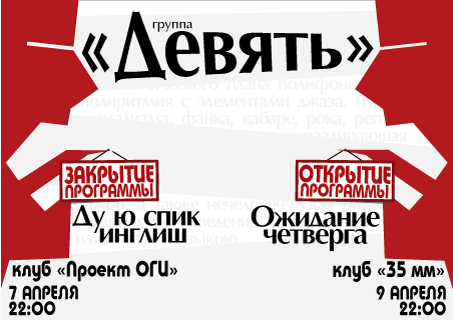 07 апреля 2005 22:00 клуб "Проект О.Г.И.": Сольный концерт группы "Девять" в культовом клубе. Окончательное и бесповоротное прощание с программой "Ду ю спик инглиш".