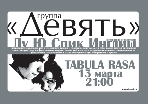 Сольный концерт группы "Девять" в стенах театра Гоголя. Играем программу "Ду ю спик инглиш" если не последний раз, то уж точно - предпоследний. Приходите, ждём!