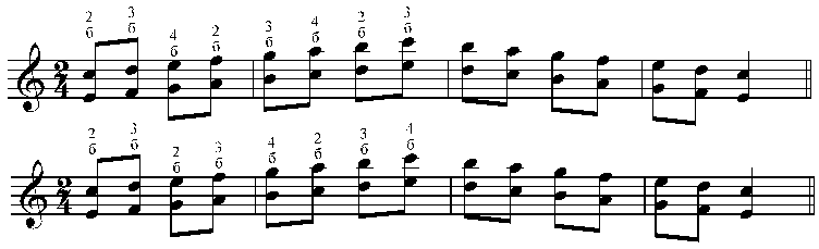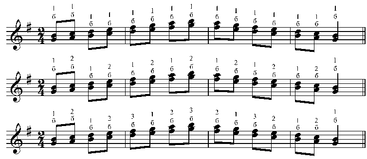— созвучие фа-ре, где 2 и 3 струны зажимаются на 1 ладу, первая на 5-м (фа-фа-ре), либо аккорд Dm (фа-ля-ре); чтобы растянуться рукой, большой палец ставится на ребро (на левое, которое по отношению к ладони «внутреннее»).