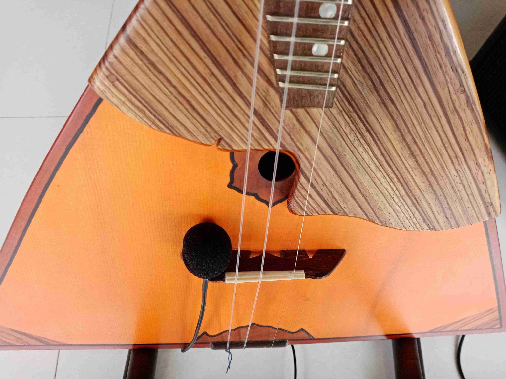 Сам микрофон ставится удобно, держится нормально, руке не мешает! Просто запихивается в отверстие, держится на трении достаточно плотно, но постоянно с ним прыгать всё же не рискнул бы. Для сидячей игры нормальное крепление. В подставке пришлось сделать вырез, также, как он расположен и на народном китайском инструменте жуань (кит. 阮), для которого этот микрофончик и сконструирован. Итак, фото набора, фото подставки без микрофона, с микрофоном (сверху и снизу), общий вид на балалайку и комбик.