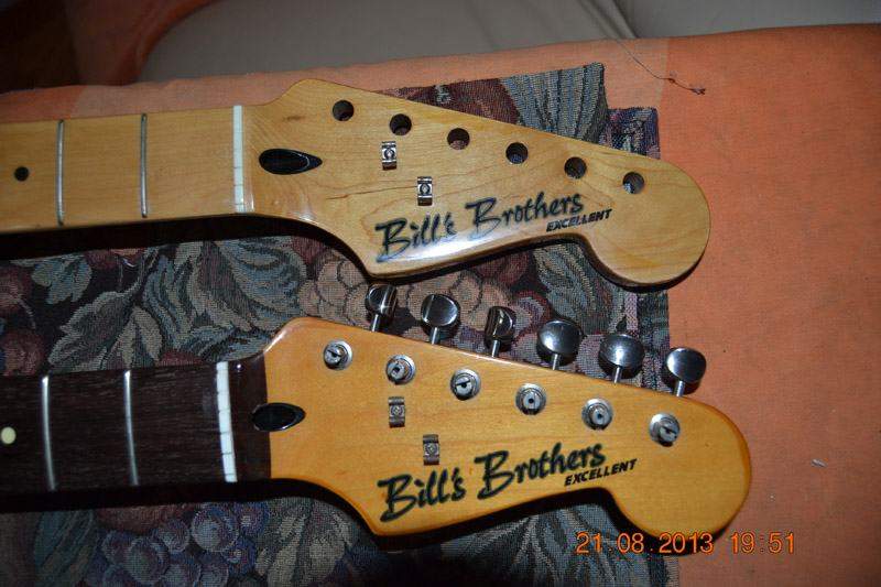 кленовый гриф, вот он как раз родной, тоже уплощен, но менее, там все заводское еще и лады совсем не изношены. А на палисандровом установлены новые. Грифы, оба ровные.