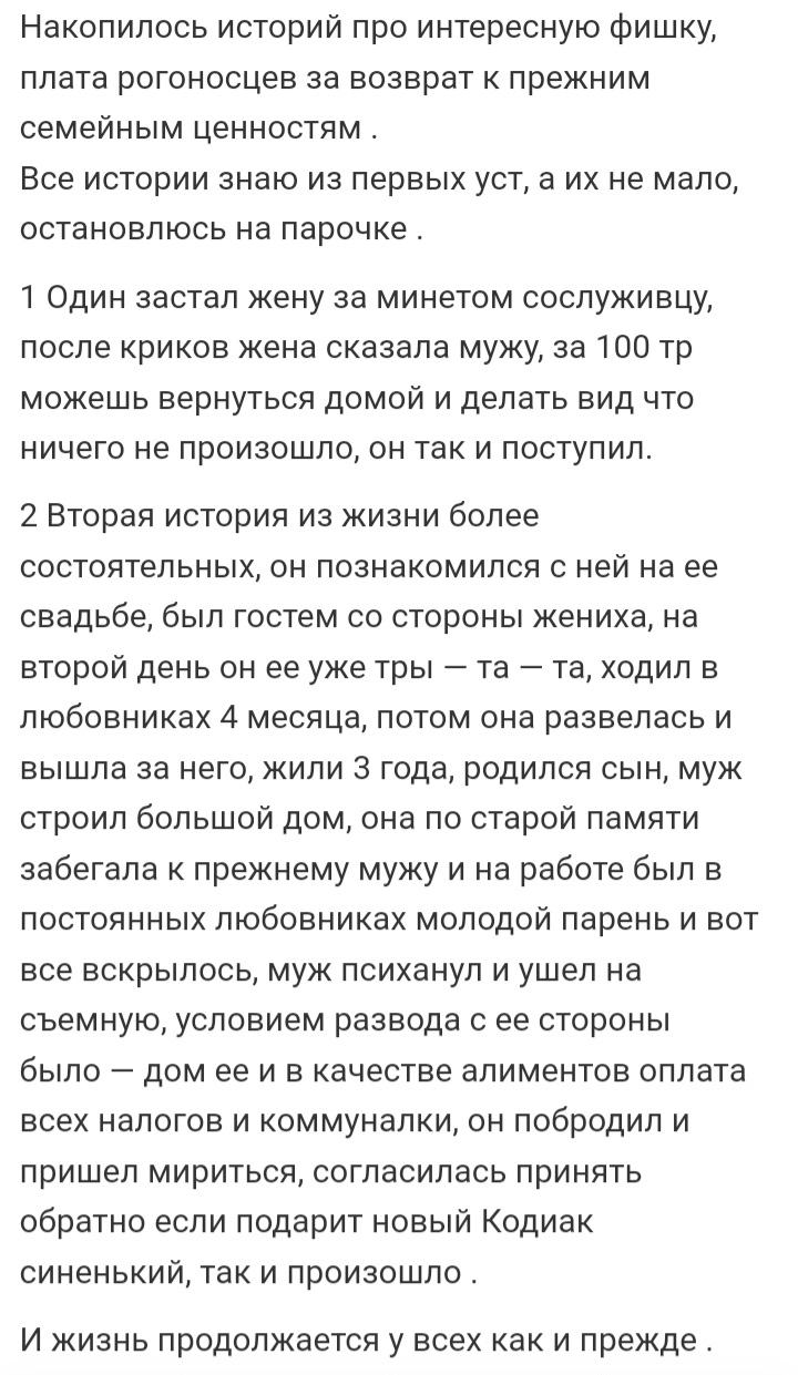 А потом...а что потом. Дальше два варианта. Либо мужчина продолжит тянуть уже невыносимо тяжёлую повозку, либо же в один момент он надоест своей женщине и она уйдёт к другому. Да, к слову, настоящий мужчина должен оставить бывшей жене и ребёнку квартиру и машину. Благородный поступок, ничего не скажешь.