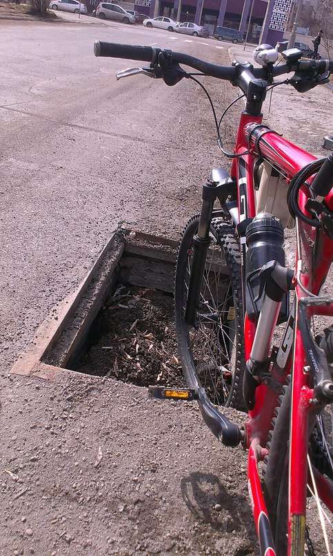и парень на сликах влетел колесом в дырку люка ( у нас люки такие есть с дырками типа \\\\ ),