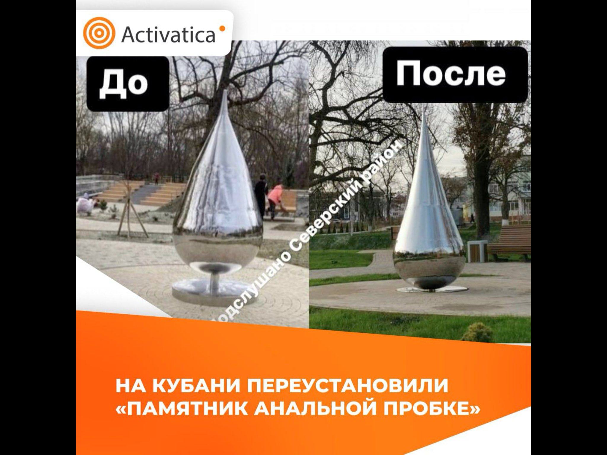 Ну ты ни разу девУшке anal plug не вставлял штоле и не знаешь, как сия фитюлька выглядит? Архитектор точно не знаком с сей приблудой...... Иначе б как-нить по-иному "каплю воды" сваял. Ну подставку в бетон под землю, а ножку в цвет окружающего ландшафта (серый?)...... Думаю, что после резонанса в интернетах они так и сделают....... Хотя - видно, что сия малая архитектурная форма сезонно-мобильная. Ну как скульптура "А.П. Чехов на пути из Москвы на Сахалин глазами лежащего на земле пьяного мужика" в Томске. С мая по октябрь на набережной стоит, потом перемещается в предбанник рЭсторана