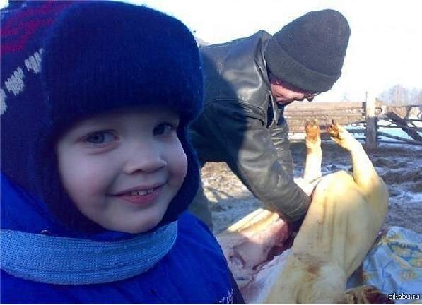 Я с раннего возраста присутствовал при опаливании и разделке свиней (при убое нет), это никак меня не травмировало.