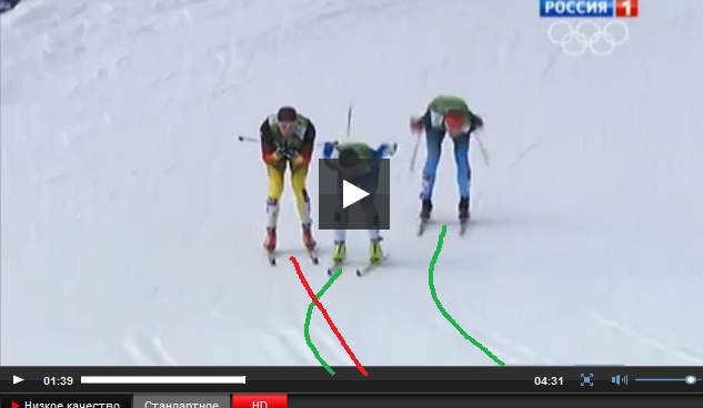 Small music tower, Немец выехал на внешний радиус, а потом, видя, что финн уже впереди, зарулил внутрь, прямо в фина. В то время как финн ехал четко на лыжню.
