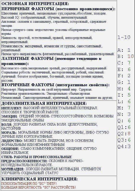 Углубленный в себя, интересующийся искусством, теорией, смыслом жизни, богатое воображение, беспомощный в практических делах, преимущественно веселый, не исключены истерические аномалии, в коллективе конфликтный, не обусловленный обстоятельствами