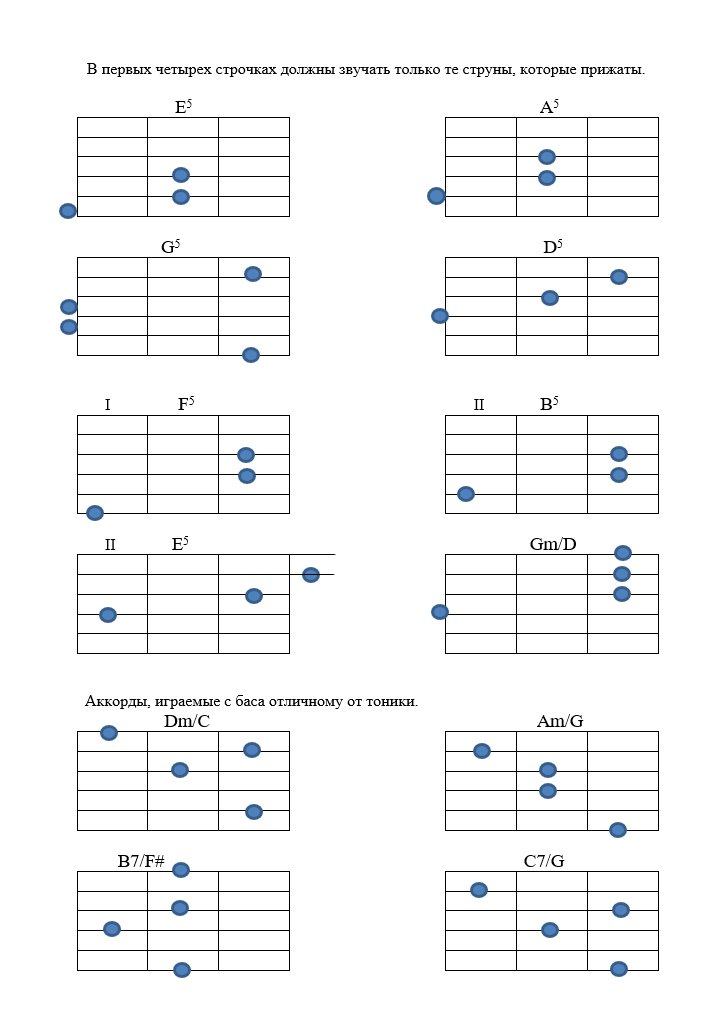 Двадцатый: Тоники сам вычисли, не играющие струны для открытых позиций (подсказка для аккордов от D 6 струна не играет), тоже. Для аппликатур перемещаемых по грифу глушится всё кроме прижатых струн. Здесь не всё аппликатуры, и возможно нужны метод рекомендации, ну это уже учебники.