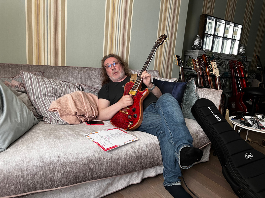 …. но тут мой старинный товарищ, прекрасный гитарист Дмитрий Андрианов , зная о моих музыкальных предпочтениях, как-то говорит мне: «А может попробовать найти выходы на В.Кузьмина и предложить ему реализовать твое давнее желание изготовить инструмент и подарить ему в знак уважения и почитания его таланта»?. Конечно я согласился. Далее Дима пообещал пообщаться со своим коллегой по цеху, гитаристом С.Куминым, который лично знаком с В.Кузьминым, и попросить его озвучить маэстро вот такую необычную просьбу. На этом и покончили. Шло время, острота за рутиной дней спала….. но тут как-то вечером звонит мне кто-то с незнакомого номера. Я снимаю трубку и слышу на том конце голос, который мне знаком уже много лет. В течение 40 минут мы разговаривали про гитары и снова про гитары. Несмотря на невероятную популярность, огромный жизненный путь в музыке и непререкаемый авторитет со мной разговаривал совершенно обычный, скромный и предельно простой человек. Так состоялось мое знакомство в Владимиром Кузьминым.