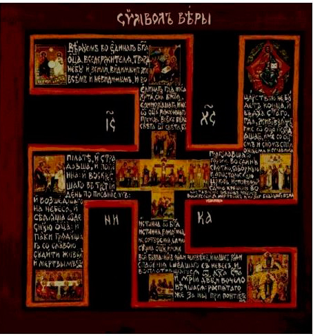 ов, союз хоругвеносцев и прочие... Все они используют свастику разного рода, лысину бреют не все, а некоторые наоборот отращивают волосы и бороду. Чтобы под черепом была каша, для этого не обязательно голову брить. ) Я, когда увидел как ДСС (сорок сороков) разрисовывают свастику, то челюсть долго искал. Вот парень на фото, из ДСС, у него на правой груди гамматический крест (свастика), и ниже фото рисунка покрупней. Конечно, гамматический крест имеет древнюю историю, и плавал он по народам и религиям по-разному, но после третьего рейха он приобрёл совершенно определённое значение и сочетать его с христианством, после 2-ой мировой, ну очень трудно... )