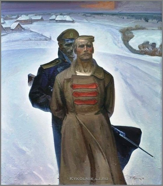 Картина называется "Братья". Брат ведёт расстреливать брата. Один белый, другой красный. Политика доводит людей до безумия, не то что дружба похеряна, а брат брата решает убить. Мозги кипят у людей. Потому что у каждого дома кипятильник - голубой, мать его, экран. Кипит и пенится в башке у многих. Так что в военное время разговор строится плохо. Вот закончится война, тогда и наговоримся. Как апостол Павел пишет: