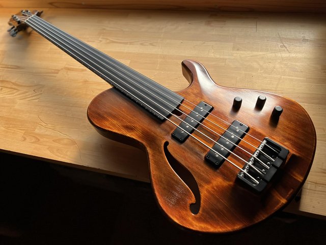 ... и добавил:Я очень люблю басы академического вида. Это наверно из-за того, что мне контрабас очень нравится, а тут маленький пятиструнный контрабас тебе, академического качества и с прекрасной электроникой. Наверно здорово звучит он. Глиссандо как протянет, прям - а!.. Люблю эти глиссандо на безладниках. Первый раз когда услышал на концерте - опупел. В наших краях ни у кого не было безладников, не слышал.