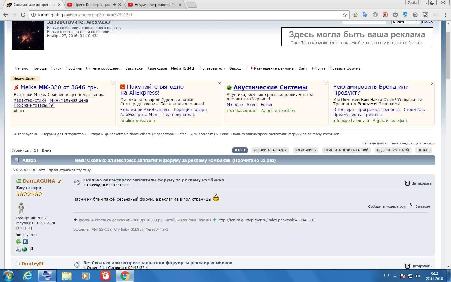 этот яндекс директ работает по своим правилам. Он может тебе вдруг начать показывать то, что ты смотрел вообще пару месяцев назад или вводил в поиске. А то что на гитарном форуме тусишь, для него это связанная тема, а значит комбики тебе могут быть интересны. Вот и показывает.
