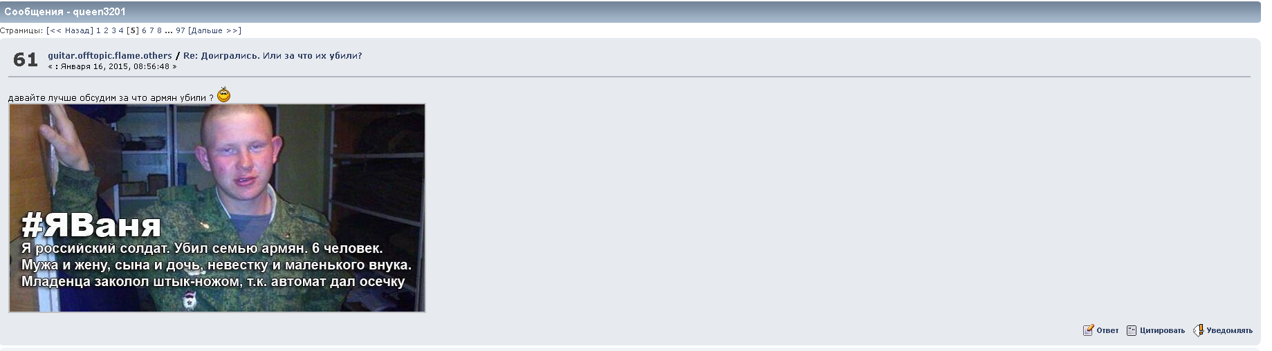 ... и добавил:где я оскорблял рф кроме как одного выродка ивана убившего армянскую семью ?