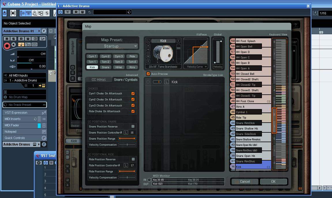 Craig, , выбираешь клавишу, на которую хочешь забить звук, выбираешь звук, жмешь кнопку "Learn", жмешь клавишу на синте, как-то так , я так делал вторую бочку