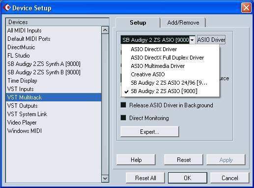 Alien Al: Смотри, кака делать: открываешь куб, потом меню Devices->Device Setup Появится окошко, как на скрине. Выбираешь пункт VST Multitrack. В списке ASIO Driver выбираешь свой ASIO4All. Можешь нажать Control Panel (кнопка под вторым списком) и посмотреть там еще настройки, но тут я не помощник)