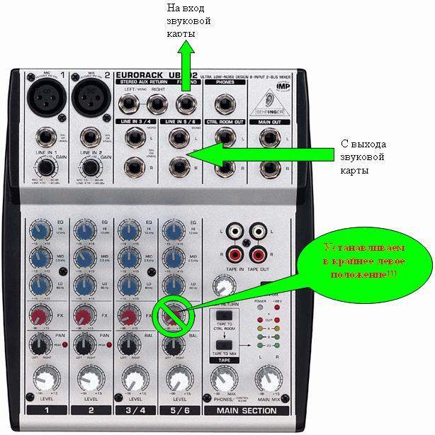 А на запись будем отправлять сигнал с FX SEND (вместо TAPE OUT). Чтобы не было описанного выше свиста при обратной связи, ручку FX на канале 5/6 выкручиваем макстмально влево (т.е. не посылаем данный канал на шину FX).