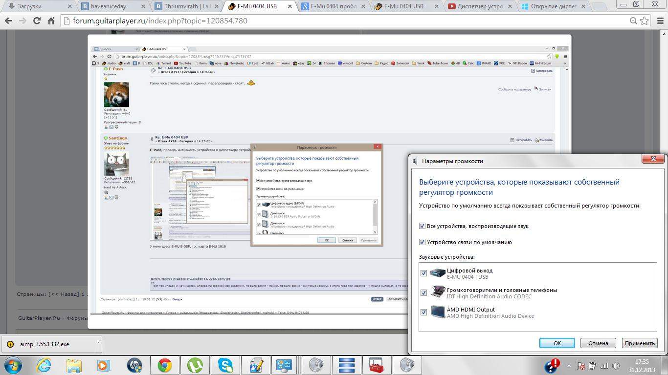 В реалтековкую (встроенную) воткнуты простые наушники с электретным микрофоном и в винде настроены, как средство связи по умолчания. Во всяких скайпах и рейд-колах настройка на реалтек, а все остальное автоматом выводит на ЕМУ.
