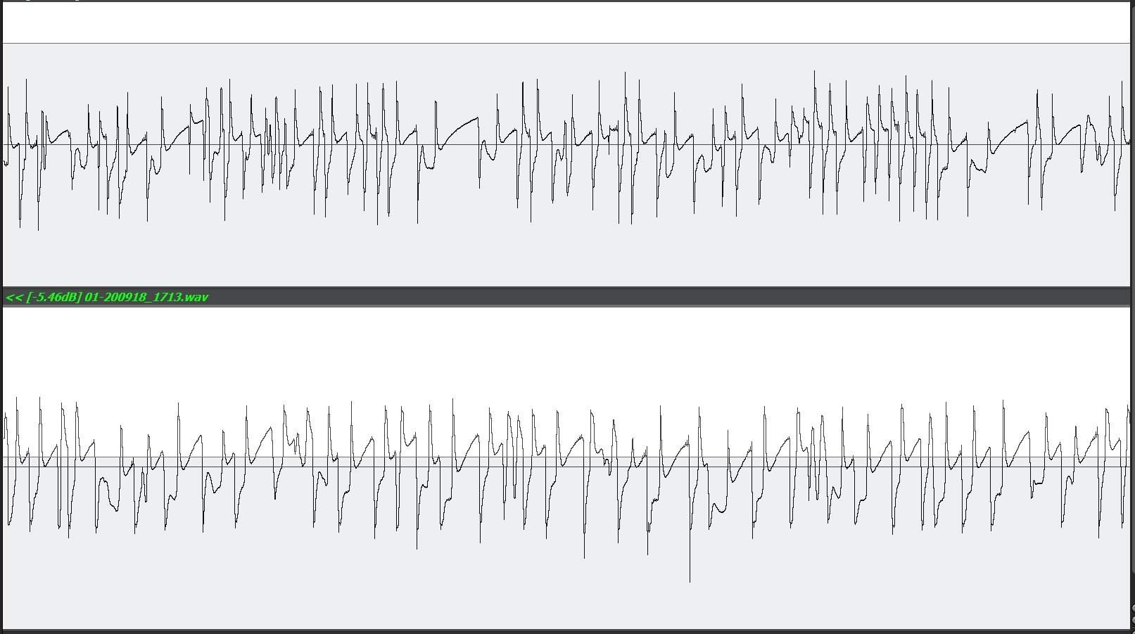 ... и добавил:Кстати форма волны то же изменяется (не только слух фиксирует изменения), не смотря на относительно низкую частоту 44.1, видно как при раскачке конца,