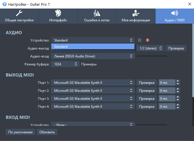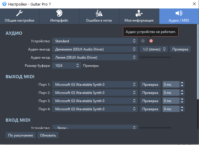Guitar Pro 7 не работает после установки внешней звуковухи с ASIO: запускается, открывает файл, но при нажатии на Плей (который ведёт себя как надо и превращается в Паузу) ничего не происходит, курсор не бежит, звука нет.