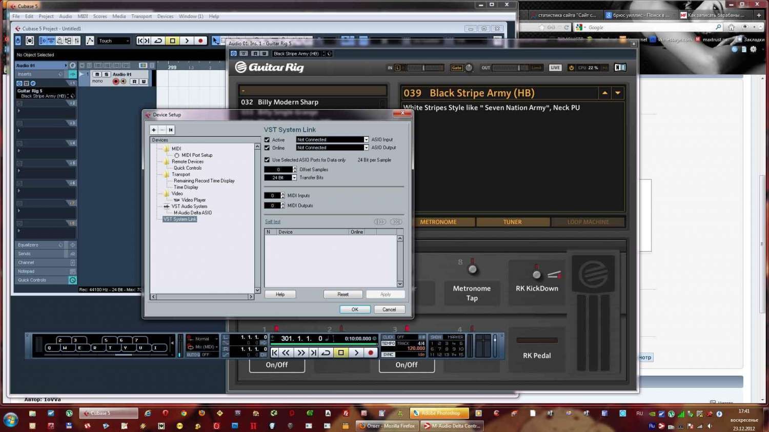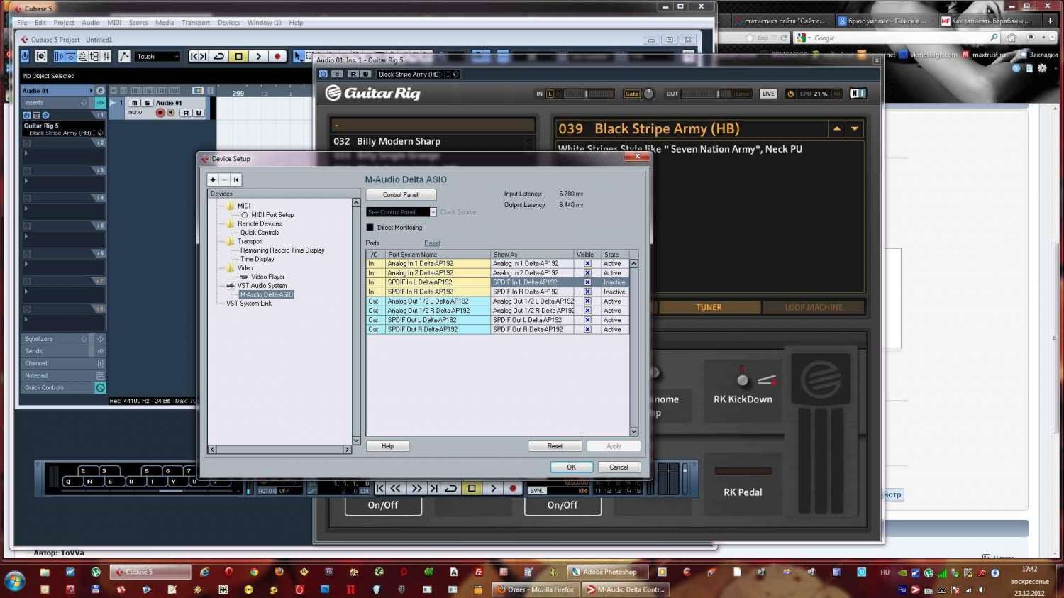 Подключил карту к ноуту, установил драйвера, звук есть, все работает. Поставил гитар риг, подключил гитару во вход А на звуковухе, далее - включаю гитар риг, играю немного, примерно от 1 до 3 минут, и звук пропадает. Причем в гитар риге видно что звук есть, и на звуковухе лампочки показывают что звук с гитары проходит, но его не слышно... Лечится отключением/включением звуковой карты или перезапуском Гитар рига. Но беда в том, что это происходит постоянно, и уже с первого такого пропадания звука слетают драйвера видимо, или хз ещё что, но в винде плееры после этого не работают, звуков вообще нет. Перезагрузка не спасает.