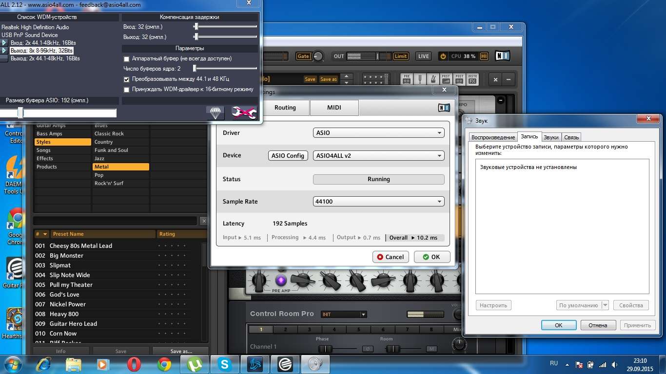 Три дня назад, я проснулся, решил сесть позаниматься, включаю GR и меня окатывает жутким фоном, таким что не слышно ни гитару, ни метроном.Отключаю от звуковой карты гитару, шнур.Фон остается, пробую встроенную звуковую ноута, эффект тот же.Естественно гейт тут бесполезен, так как выкручивать его, чтобы избавится от фона, нужно почти на максимум, да и тем более, я месяц использовал GR и все было хорошо.Решил установить amplitube, все подключил , фон такой же как и в GR. Четыре дня страдаю и играю на не подключенной гитаре.