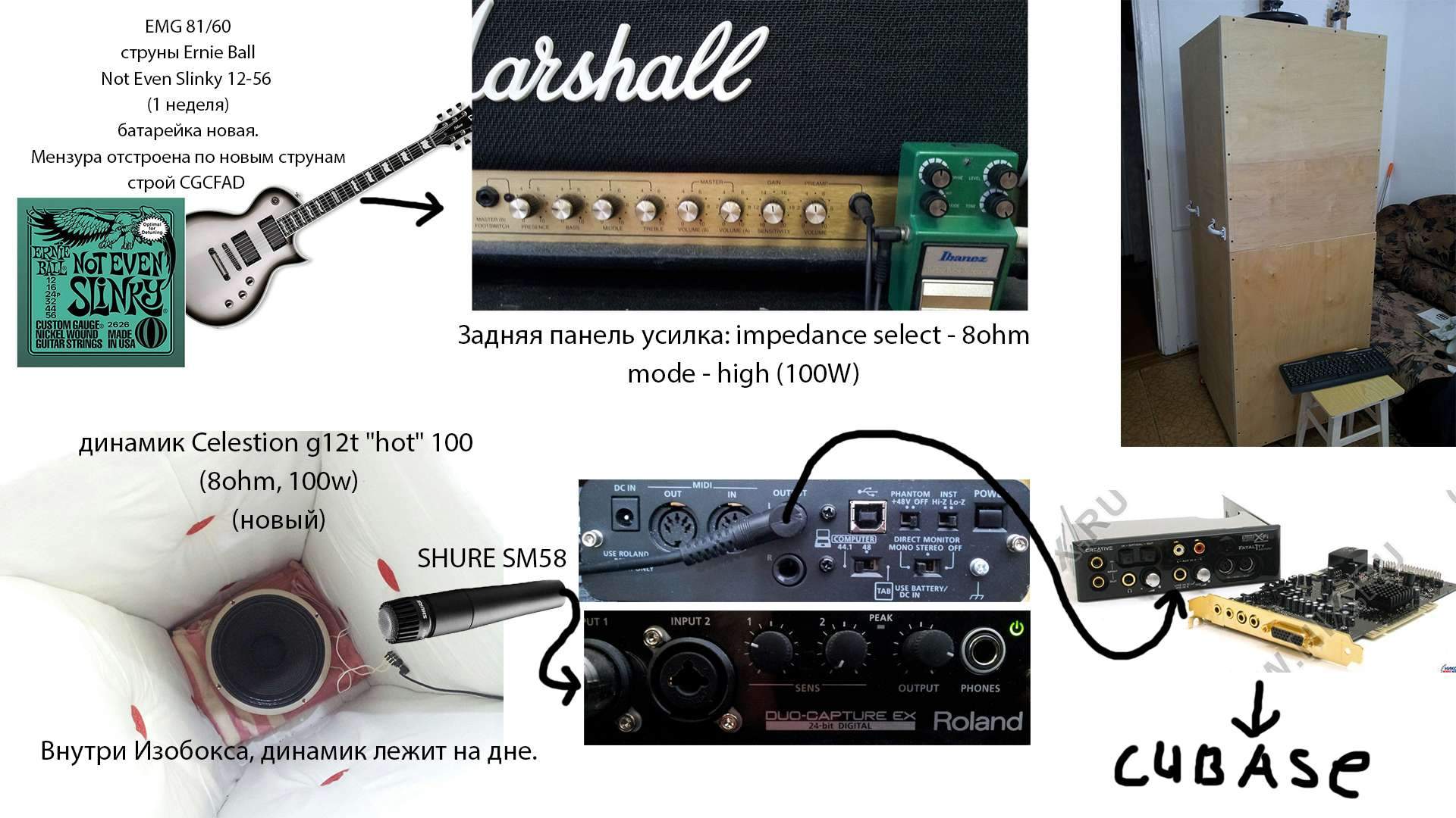 Гитара: ESP LTD EC-1000 (silverburst), корея, EMG 81/60, струны Ernie Ball - Not Even Slinky 12-56 (неделя им), строй CGCFAD (по тюнеру), мензура отстроена, батарейка новая, всё заводское, без ремонта.