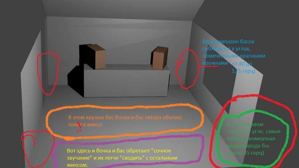 P.S. Сделал замеры и сейчас дошло, что бас который слышен у задней стены комнаты (фиолетовый овал) это как раз сильно резонирующий угол комнаты(зеленый круг) Хз почему, но именно в этом углу все низы самые "громкие".
