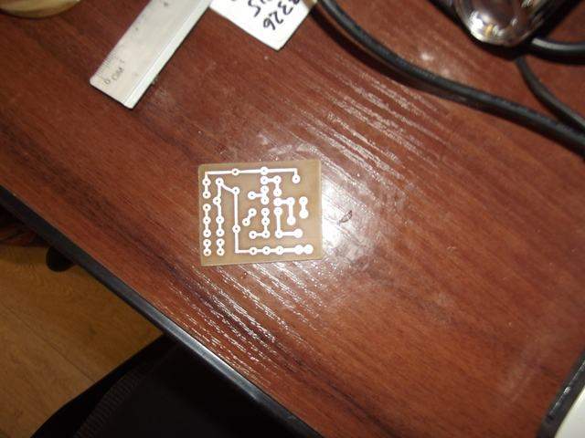 Плату решил делать традиционно для диванных паяльщиков - технологией ЛУТ.. Распечатав на работе про запас 12 экземпляров на одном листике (благо платка маленькая 4х4,5 см), забодяжил плату (получилось, кстати, с первого раза). На фото плата после травления: