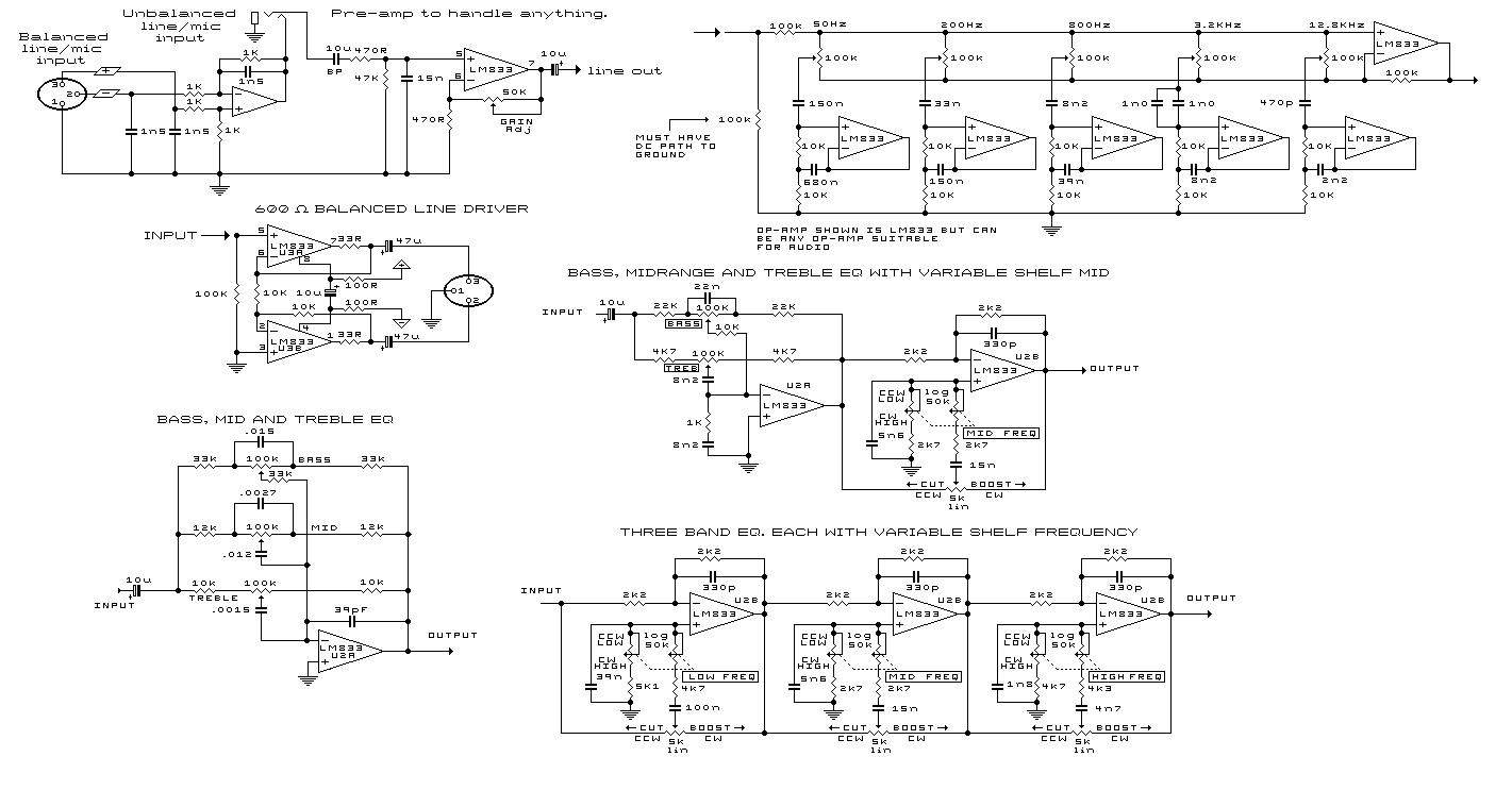 например верхняя левая схема, preamp to handle anything.. довольно стандартная схема, похожая была в преде от AZG но я щас немогу ее найти)) все банально, одна половика операционника делает баланс в небаланс, вторая усиливает..