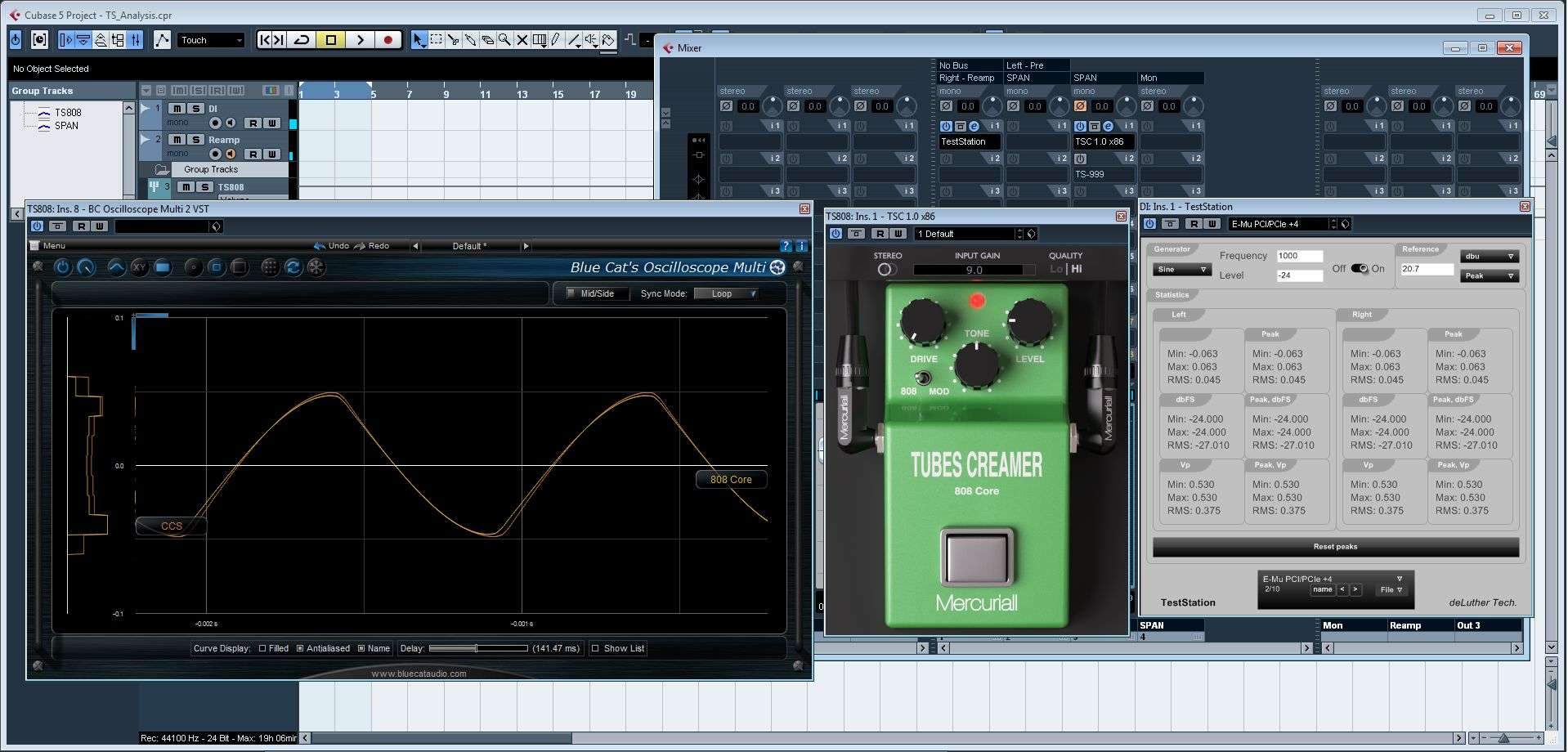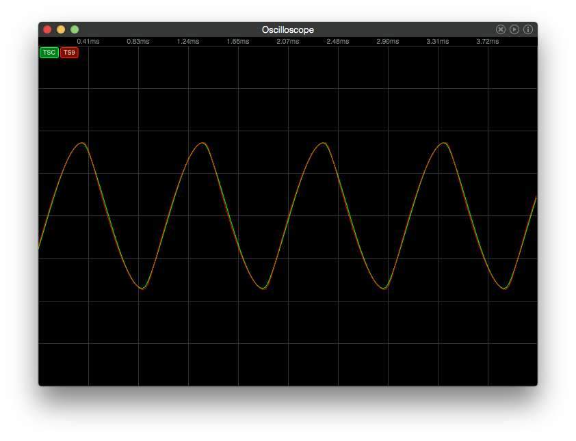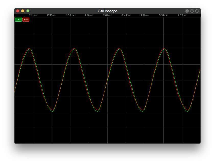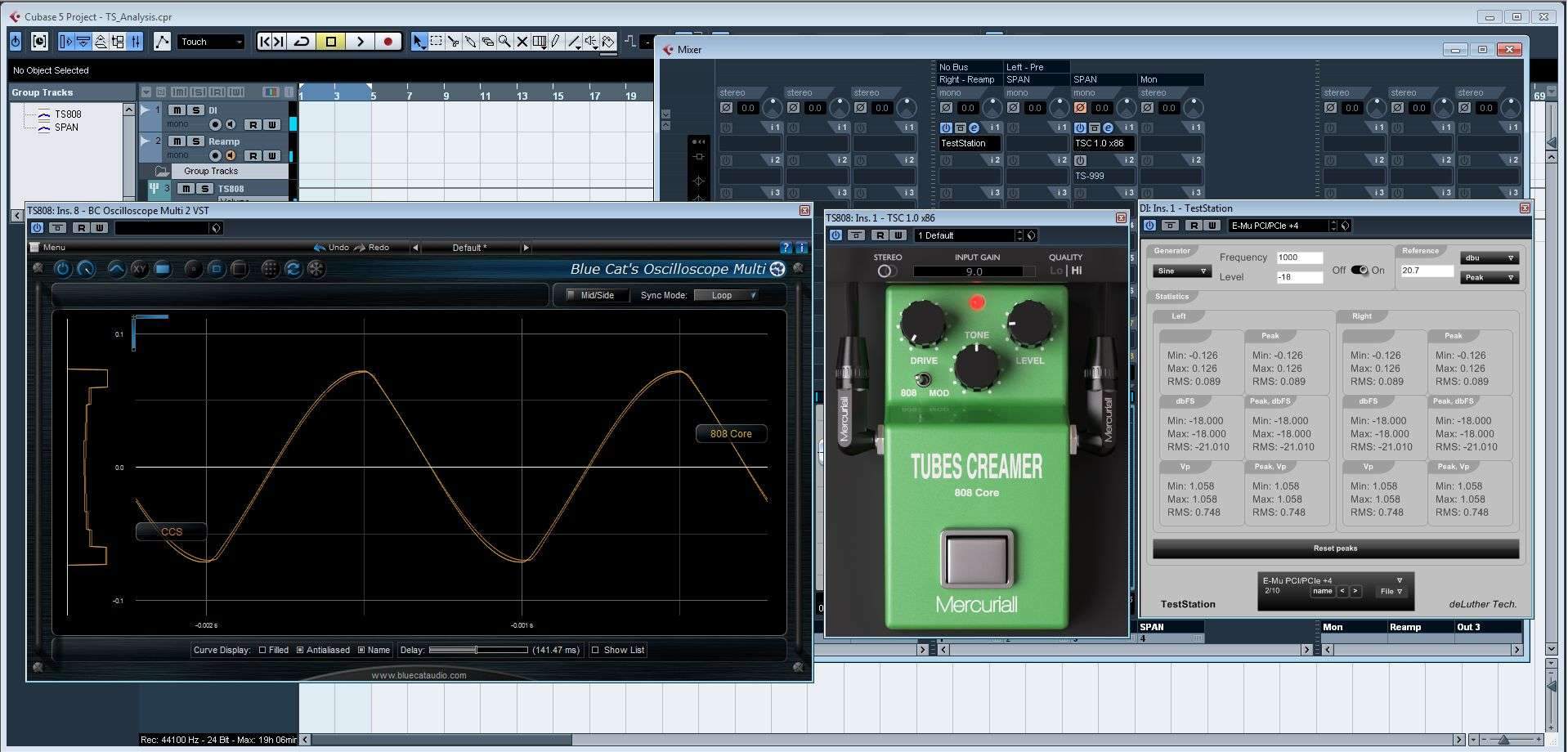 Я запускал генератор с уровнем -12 dbFS, на выходе у моего интерфейса это пара вольт. Поэтому входной уровень в плаге и выставлял 9 (если это действительно 18 Дб). Гейн плага на минимум, тон на серёдку, левел, как я уже написал, чтобы выровнять уровень с железкой, на форме сигнала уровень не сказывается (кроме, естественно, увеличения амплитуды сигнала) и у железки тоже.