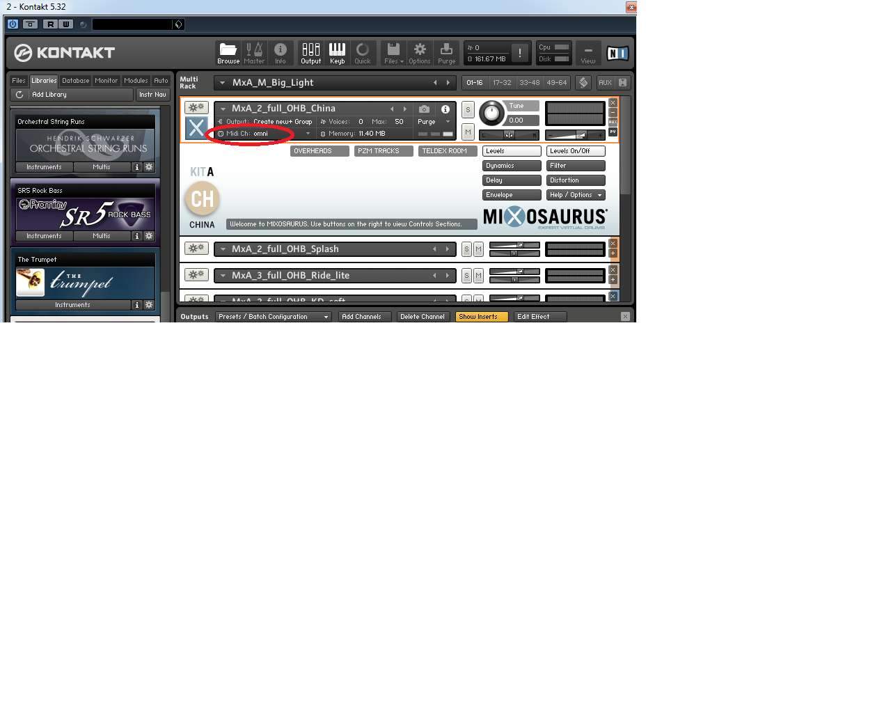2) добавляю инструмент (на примере рабочего барабана) и отсылаю на микшер куба - картинка "1";