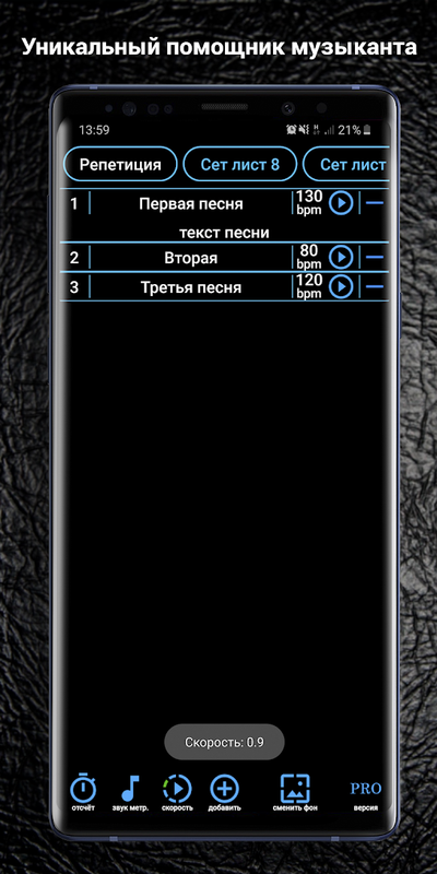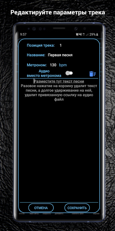 Удерживайте палец на нужном элементе, чтобы активировать дополнительные функции: удерживая палец на названии, откройте редактирование трека или сет листа, остановите воспроизведение вместо паузы, верните нормальную скорость воспроизведения и замените аудио-трек песни, предварительно удалив путь до предыдущего долгим нажатием на корзину в окне редактирования трека.