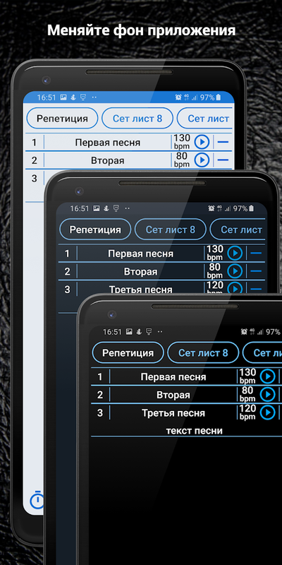 Описание:MusHelp - решит вашу проблему с организацией репетиций, составляйте сет-листы с нужным порядком, тексты песен и аудио треки теперь всегда под рукой, задавайте точный темп композиции с помощью встроенного метронома с функцией предварительного отсчёта, замедляйте аудио для тренировки в более низких темпах.