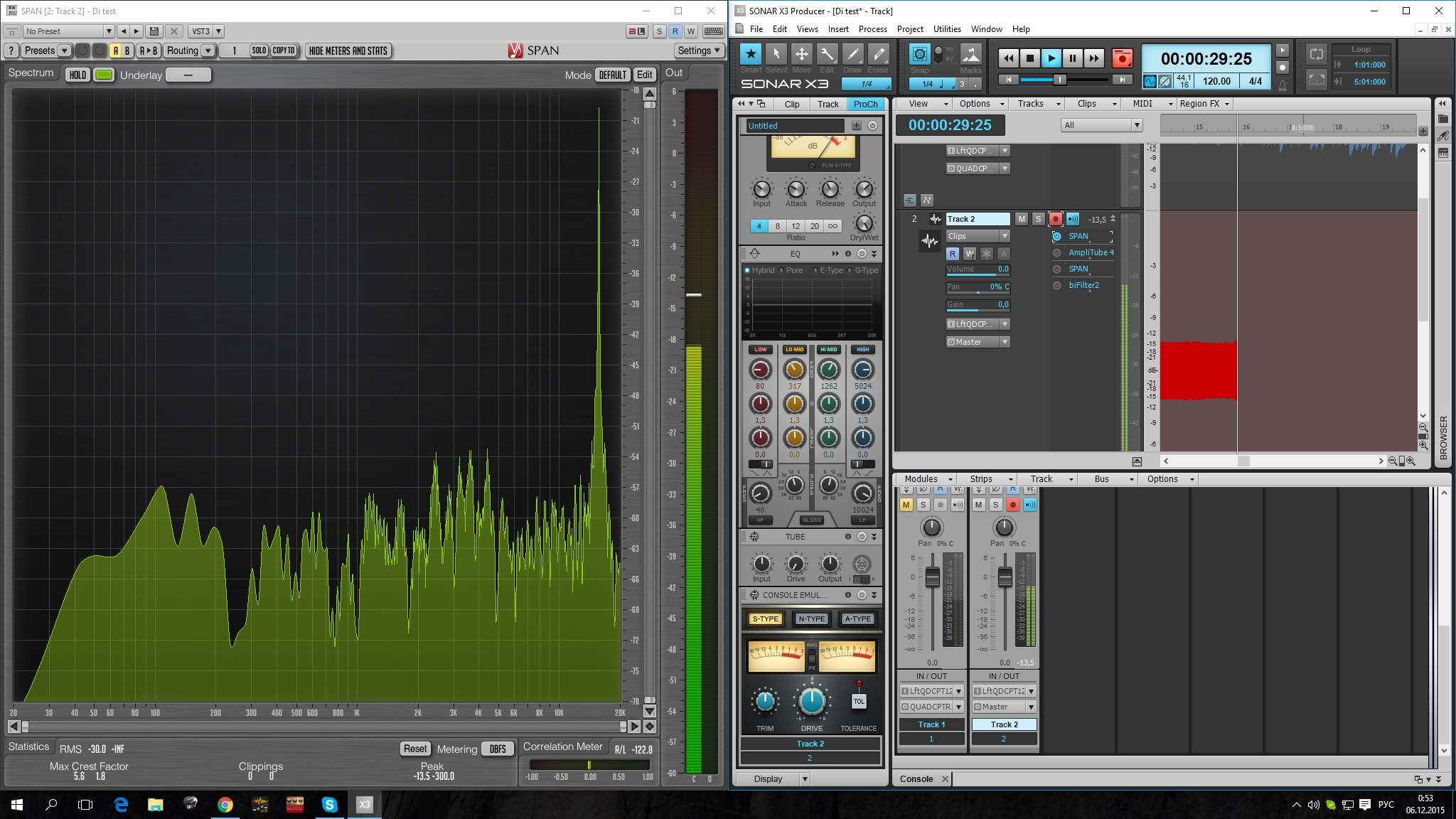 Здравствуйте! Хочу спросить, может кто знает. Имея в наличии комбик Peavey Classic 30 решил как-то для "тихой" игры купить преамп, дабы играть в наушниках, выбор пал на RnR Sl/LD. Замечательный преамп оказался, но если бы не одно но: он жутко фонил. Списавшись с разработчиком, выяснил, что не в преампе вовсе дело, а в рядом стоящей телевышке, да и в том, что в доме нет заземления. Но меня до сих пор мучает вопрос, неужели только из-за этого я не могу нормально играть через данный предусилитель? Примеры фона и спектр фона прилагаю. На второй фотографии, и в конце аудиофайла я прижал выходы преампа рукой.