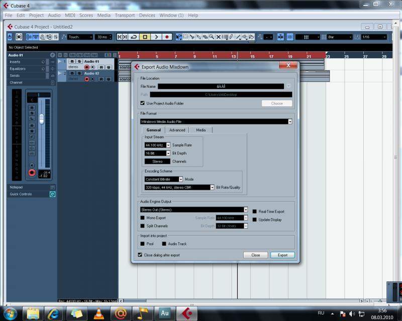 Коркодилов Дениска, Смотри, я тебе на пальцах объясню. У тебя на скрине есть единственная красная горизонтальная полоса - видишь? Подведи стрелочку мышки к ее правому верхнему краю, нажми левую кнопку мышки, и не отпуская ее двигай мышку влево. Красная полоса при этом будет соответственно двигаться влево со стрелочкой мышки. Доведи это дело до крайнего левого угла (начала микса). Затем проделай эту же операцию наоборот: левый верхний край красной полосы стрелочкой мышки двигай вправо до конца микса. И эта красная полоса превратится в синюю. И все - дальше делай все так, как ты делал и раньше: меню "Экспорт файл" и т.д.