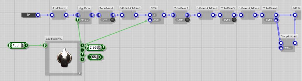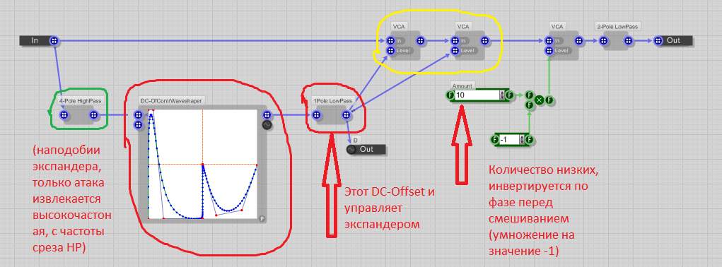 Желтым цветом обозначены модули для отделения низкочастотной атаки от остальной части звука каждой ноты. После них идет Low Pass с частотой среза 100Hz