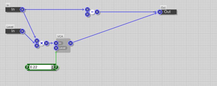Ошибка заключается в том, что сигнал после перемножения должен вычитаться с первым необработанным сигналом, но он наоборот к нему прибавляется