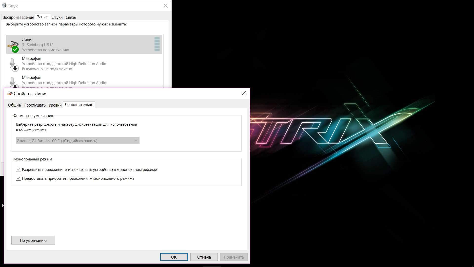 Вобщем купил я заместо своей Line 6 UX2, steinberg ur12. Захожу как обычно в pod farm подрынькать а там жуткий свисти пердеж. Может ли быть такое что ur12 несовместим с Pod farm, или любая карточка должна работать с фермой? Или проблема может быть в чемто другом ? И заодно вопрос спецам такой. Почему в настройках звука виндоус немогу менять битность и частоту строка выделена серым цветом и её не нажать? (фото приложил) я впервые с таким столкнулся.