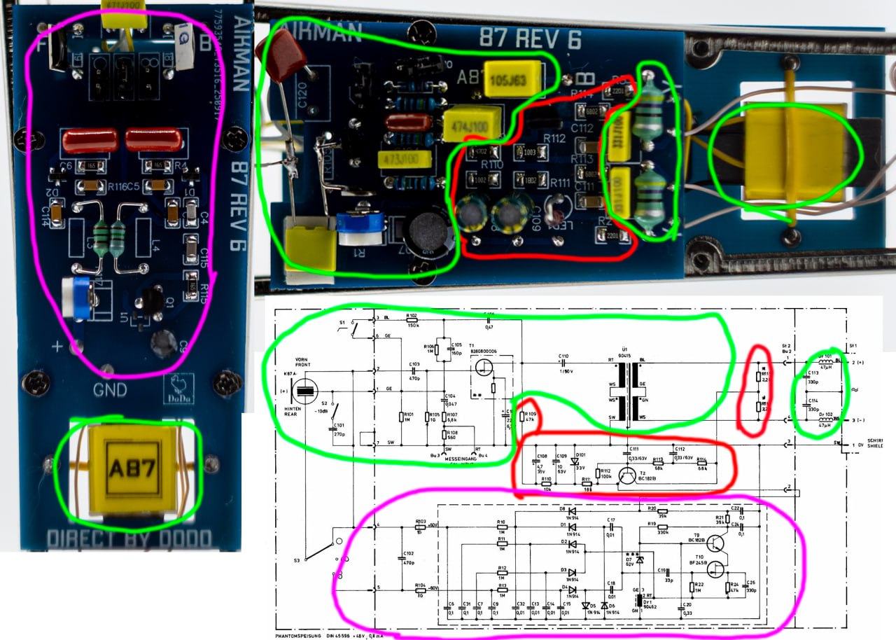 Что касается SMD-деталей, они находятся только в питании, в звуковом тракте (обведен на картинке зелёным) нет ни одной SMD детали или керамического конденсатора, SMD никак не влияют на поляризацию капсюля и, соответственно, не могут влиять на звук. Поляризацию определяет схема и стабильность напряжения, а не форм-фактор деталей.