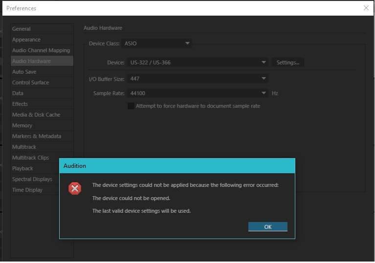 Нарисовалась непонятная ошибка. Звуковая карта Tascam US-366. Я уже работал в аудишн с ней и всё было хорошо.