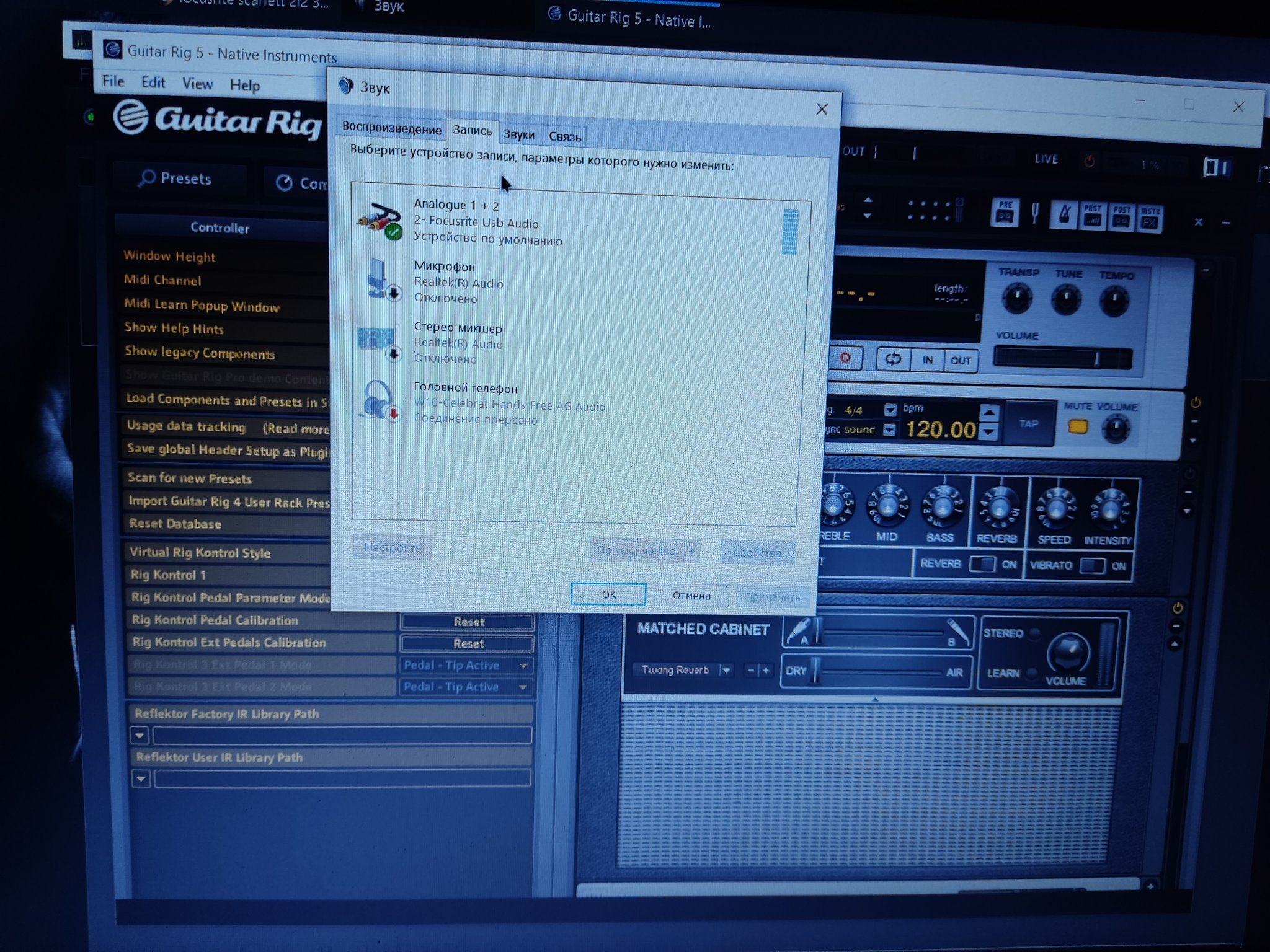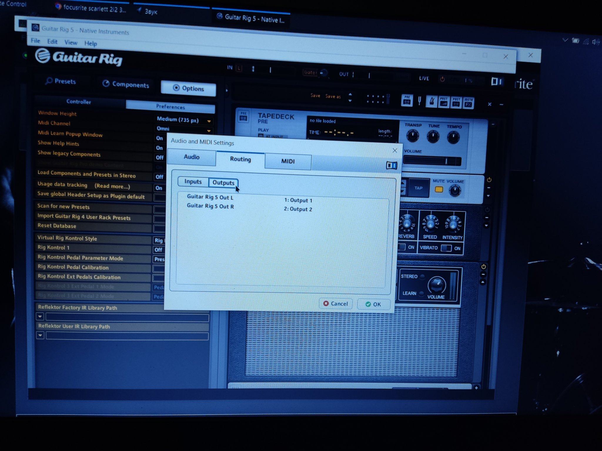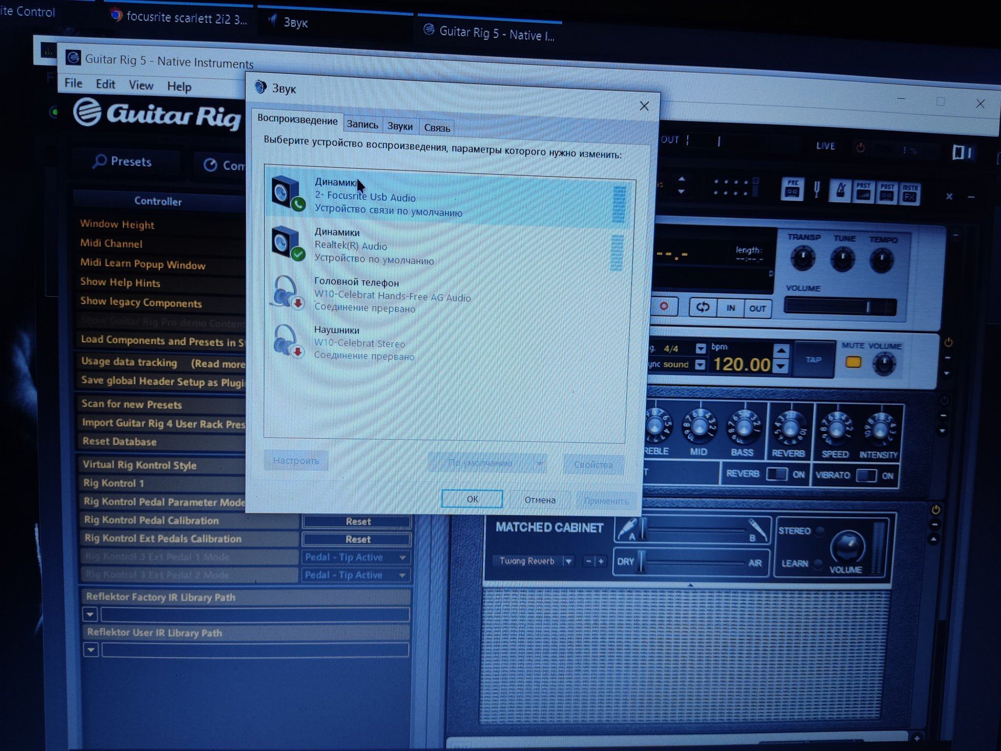 парни подскажите пожалуйста уже вес мне перелопатил, что делать подключил карту focusrite 2i2 3rd к ноутбуку, зарегал на сайте, скачал драйвер, включил гитар риг выбрал внешнюю карту, а звука нет!!! При этом когда бью по струнам в гитар Риге в вернём углу показывает как будто звук от гитары принимает, но не воспроизводится, мониторов у меня нет только звук от динамиков ноутбука!