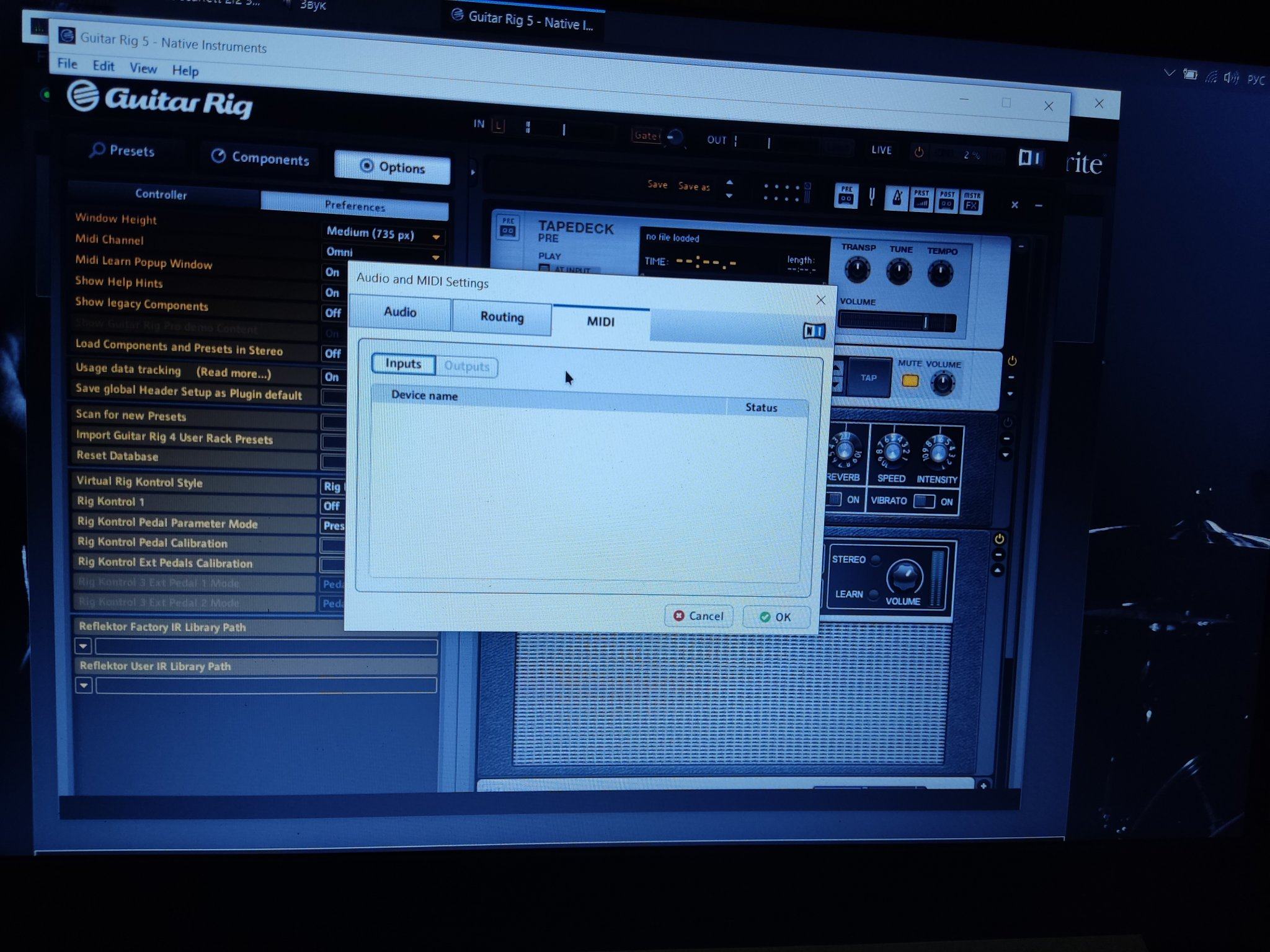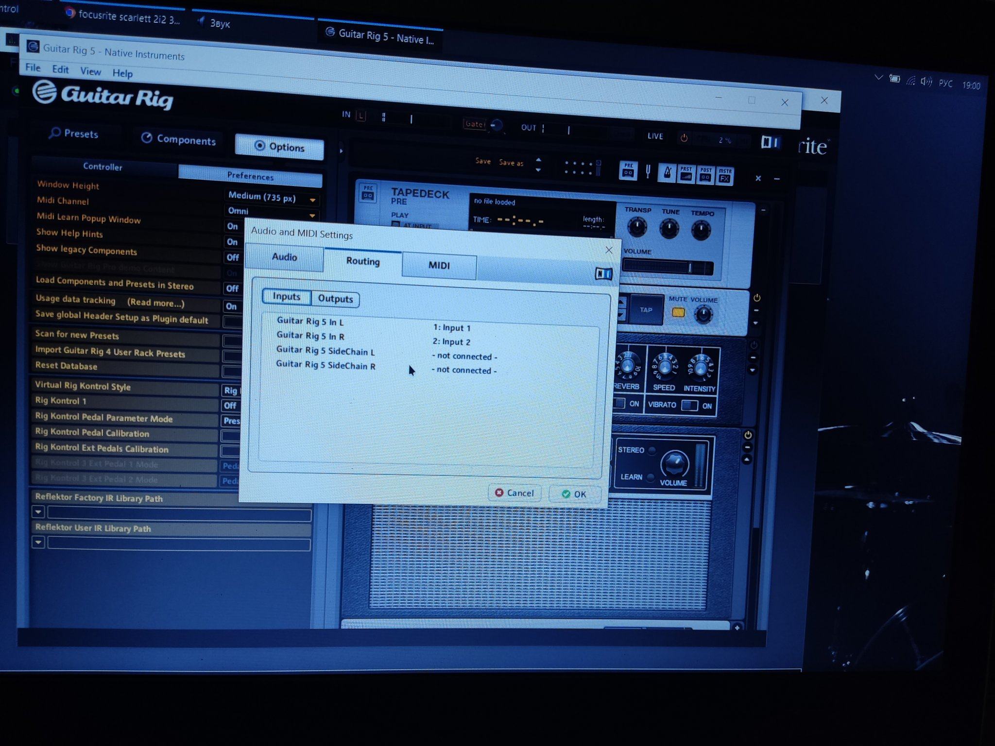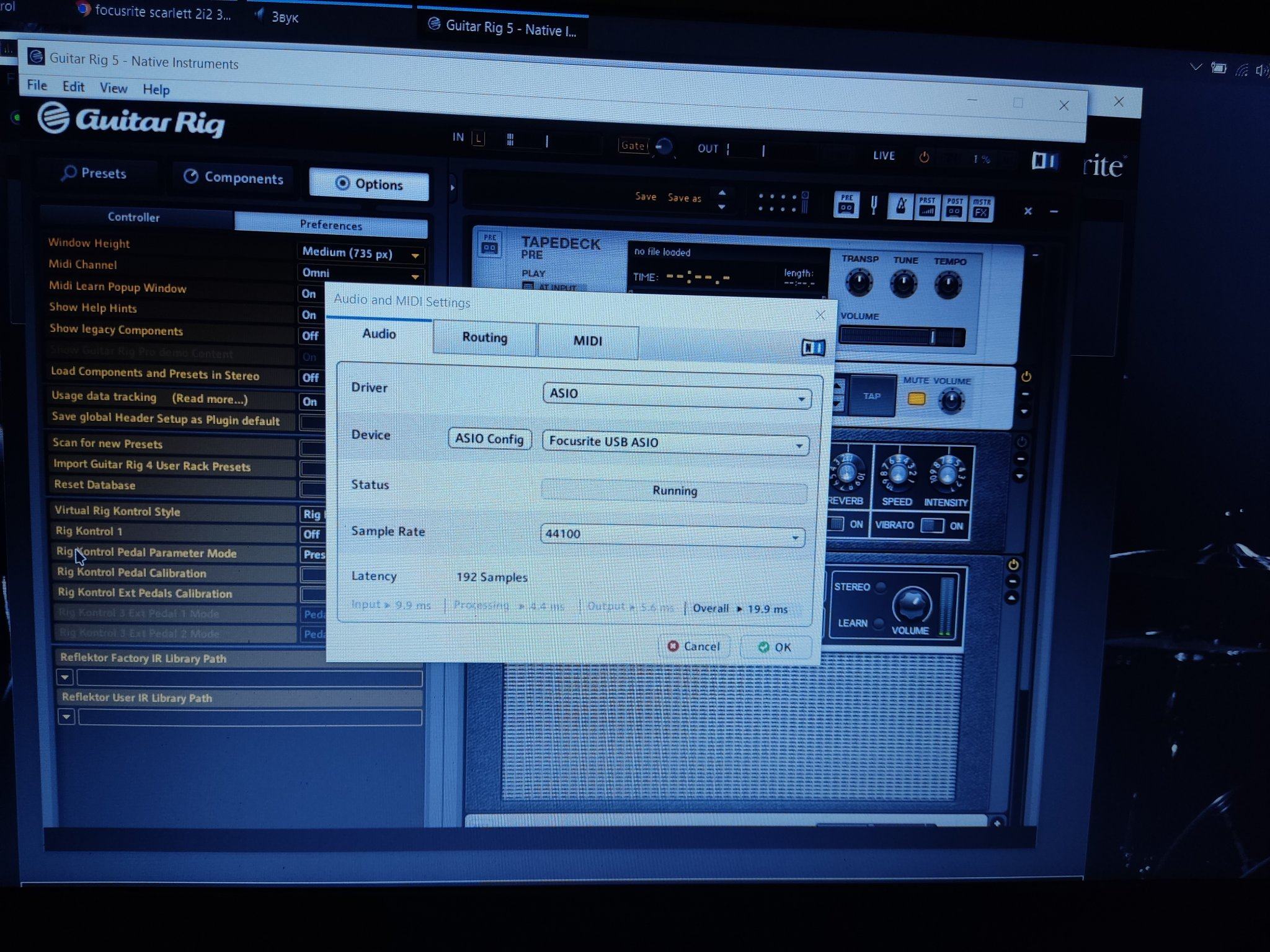 парни подскажите пожалуйста уже вес мне перелопатил, что делать подключил карту focusrite 2i2 3rd к ноутбуку, зарегал на сайте, скачал драйвер, включил гитар риг выбрал внешнюю карту, а звука нет!!! При этом когда бью по струнам в гитар Риге в вернём углу показывает как будто звук от гитары принимает, но не воспроизводится, мониторов у меня нет только звук от динамиков ноутбука!