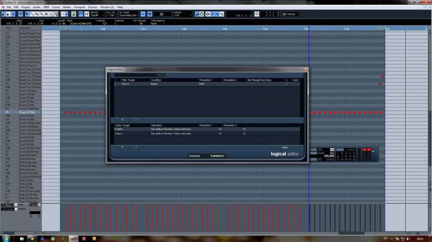 Note (в этот тип вроде входят только Note On и Note Off). а дальше в этом пресете я говорю раскидать велосити (для события ноты Value 2 - это велосити, Value1 - сама нота, но вообще эти Value 1,2,3 зависят от того, с каким типом событий работаешь) в рамках от -10 до +10 единиц от текущего значения, позицию в рамках от -10 до +10 относительно текущей позиции. 10 - это величина то ли в мс, то ли в тиках, не знаю. я параметры фильтра и трансформера распишу на днях.