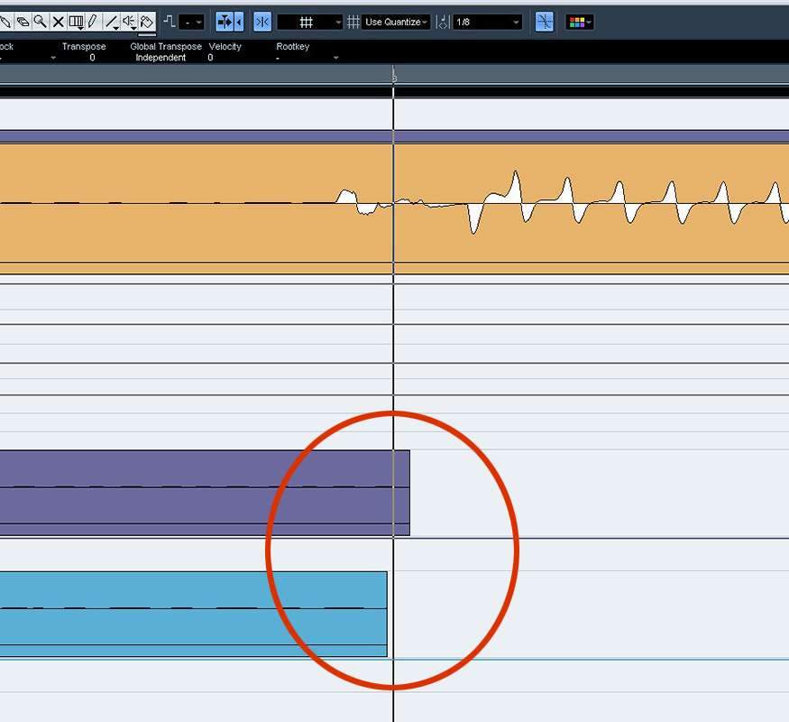 Друзья, подскажите пожалуйста, что за дела творятся? Внезапно при записи обнаружил, что гитарные дорожки перестали выравниваться по сетке: одна заезжает на следующий такт, вторая наоборот, не достает. Скрин прилагаю. Алигн включен, курсор на границе долей. Тяну край дорожки к курсору, а у нее, такое ощущение, что сетка сместилась.