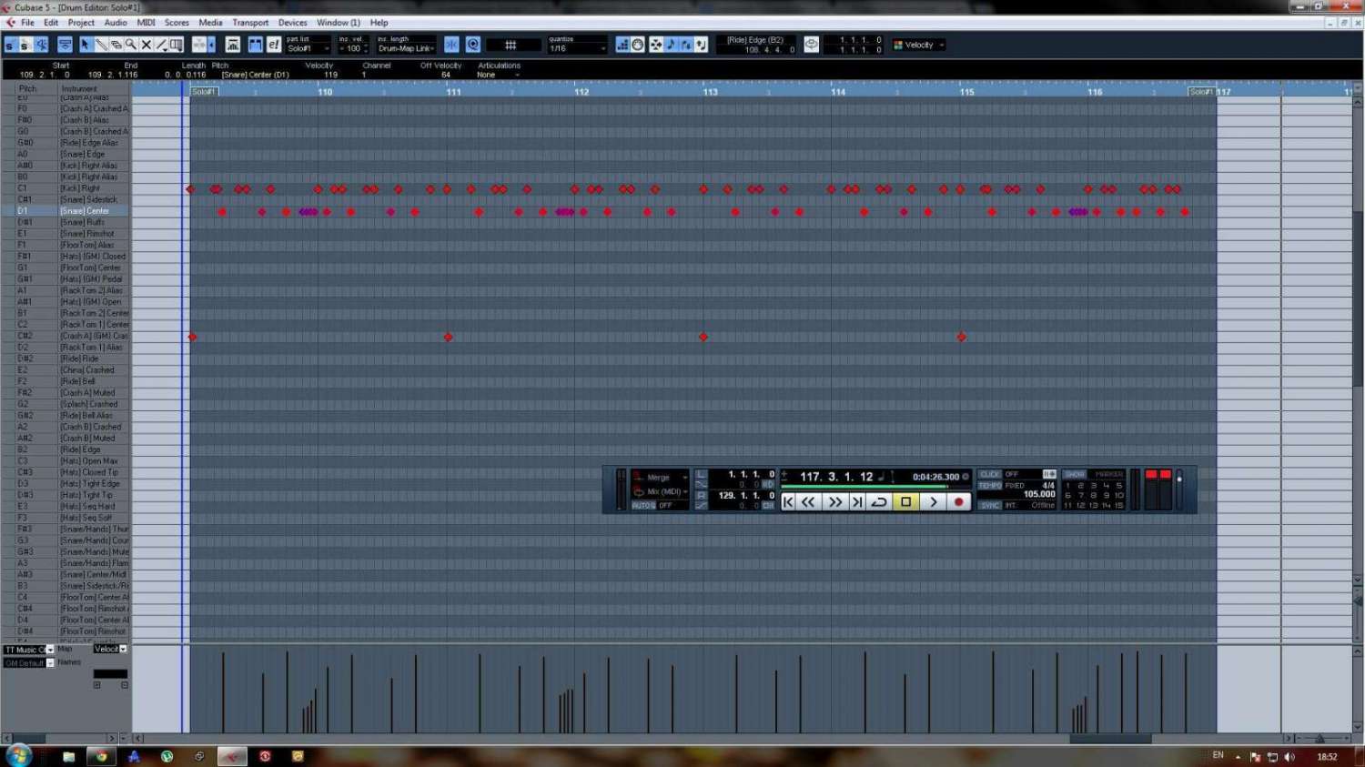 1) работать гораздо удобней, когда миди-треку с ударными назначена барабанная карта того vst-банка, который подключен. тогда в описаниях drum-editor'а всё правильно. да, drum-editor. многие почему-то про него не знают. в нём нужно забивать ударку, а не в пиано-ролле. прицепил скрин с drum editor'а с подключенной картой для SD Music City.