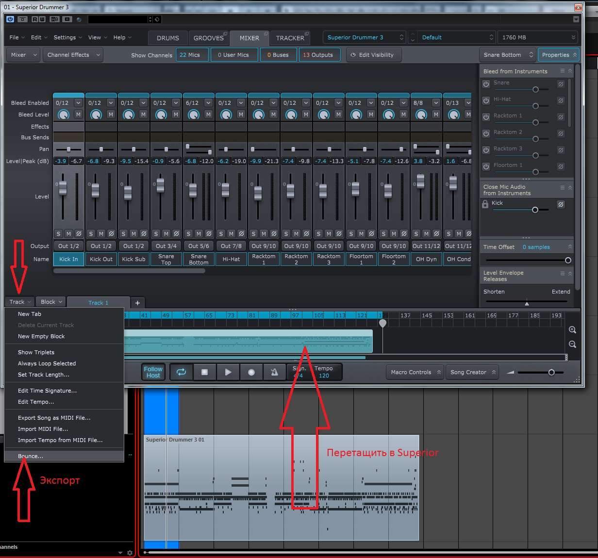 Создаем и редактируем миди дорожу, затем перетаскиваем её из окна проекта в окно Superior Drummer 3