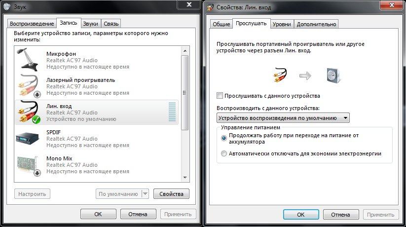 Сделать по умолчанию линейный вход и в свойствах убрать галочку "Прослушивать с данного устройства". Это типа мониторинга. Только эта настройка иногда глючит, звук идёт даже без галочки. Тогда нужно поставить галочку, применить, потом убрать галочку, применить.